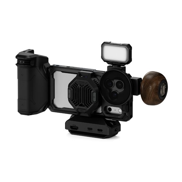 В комплект входит ручка Khronos Focus PD Handle со встроенным аккумулятором, кнопкой записи и цифровым кольцом для точного управления фокусом и масштабированием через Bluetooth. Ручка заряжается через USB-C и одновременно питает смартфон.