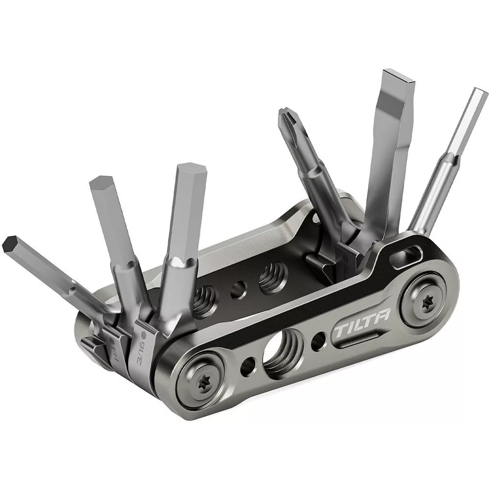 Этот многофункциональный мини-набор инструментов от Tilta включает в себя шесть универсальных инструментов, в том числе шестигранные ключи и насадки для отвёрток, которые пригодятся при сборке, разборке и повседневном использовании оборудования. Инструменты изготовлены из нержавеющей стали, что обеспечивает их долговечность и устойчивость к ржавчине. Многофункциональный мини-набор инструментов имеет корпус из алюминиевого сплава со стильным титаново-серым покрытием. Корпус оснащён одним креплением с резьбой 3/8″-16 и двумя креплениями с резьбой 1/4″-20 для дополнительной универсальности. Он достаточно мал, чтобы поместиться на ладони или в кармане, и имеет удобную петлю для крепления на ремне, чтобы его можно было носить с собой.