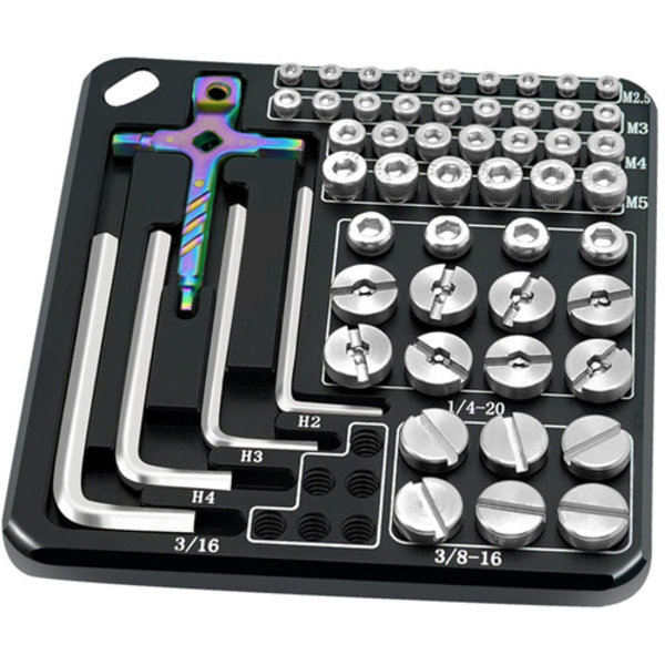 В комплект также входят двенадцать винтов 1/4″-20, шесть 3/8″-16, девять M2.5, девять M3, семь M4 и шесть M5, а также пять шестигранных ключей для их крепления, которые хранятся в магнитных слотах. На пластине также есть отметки, указывающие, винты какого размера находятся в слотах. Прорезь на углу позволяет повесить пластину на ремешок, крючок или карабин.