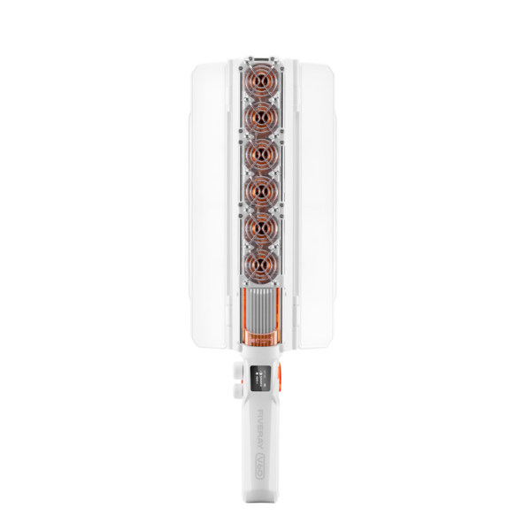 Встроенные вентиляторы обеспечивают эффективное охлаждение источника света, благодаря чему его можно использовать даже при высоких температурах окружающей среды или в течение длительного времени. Встроенная батарея обеспечивает 24 мин работы при 100% яркости (60 Вт), доступна быстрая зарядка PD (Power Delivery, 100 Вт) через разъем USB-C или работа от сети при использовании фирменного адаптера питания 24 В /5 A.