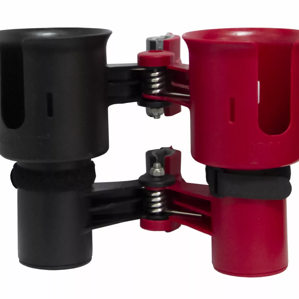Каждое изделие с базовой комплектацией состоит из двух прочных пластиковых подстаканников, объединенных пружинным механизмом. Он отвечает за фиксацию конструкции на перекладинах с круглым или прямоугольным сечением. Благодаря ребристым резиновым вставкам на зажимах, RoboCup не скользит по штативу, стойке мебели или направляющей телеги.