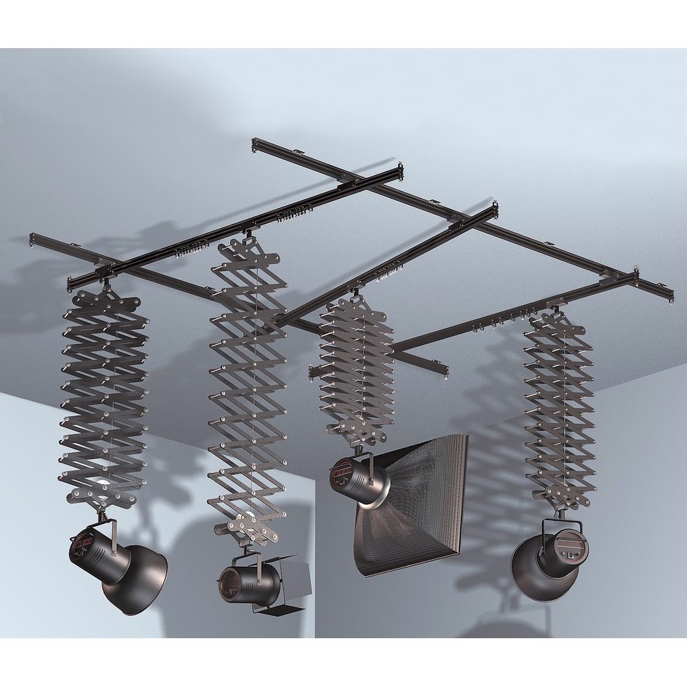 Полный комплект для больших студий, состоит из 2х фиксированных рельс длиной 5 м, 3х подвижных рельс длиной 3 м и держателей для источников света (4 подвесной пантограф).