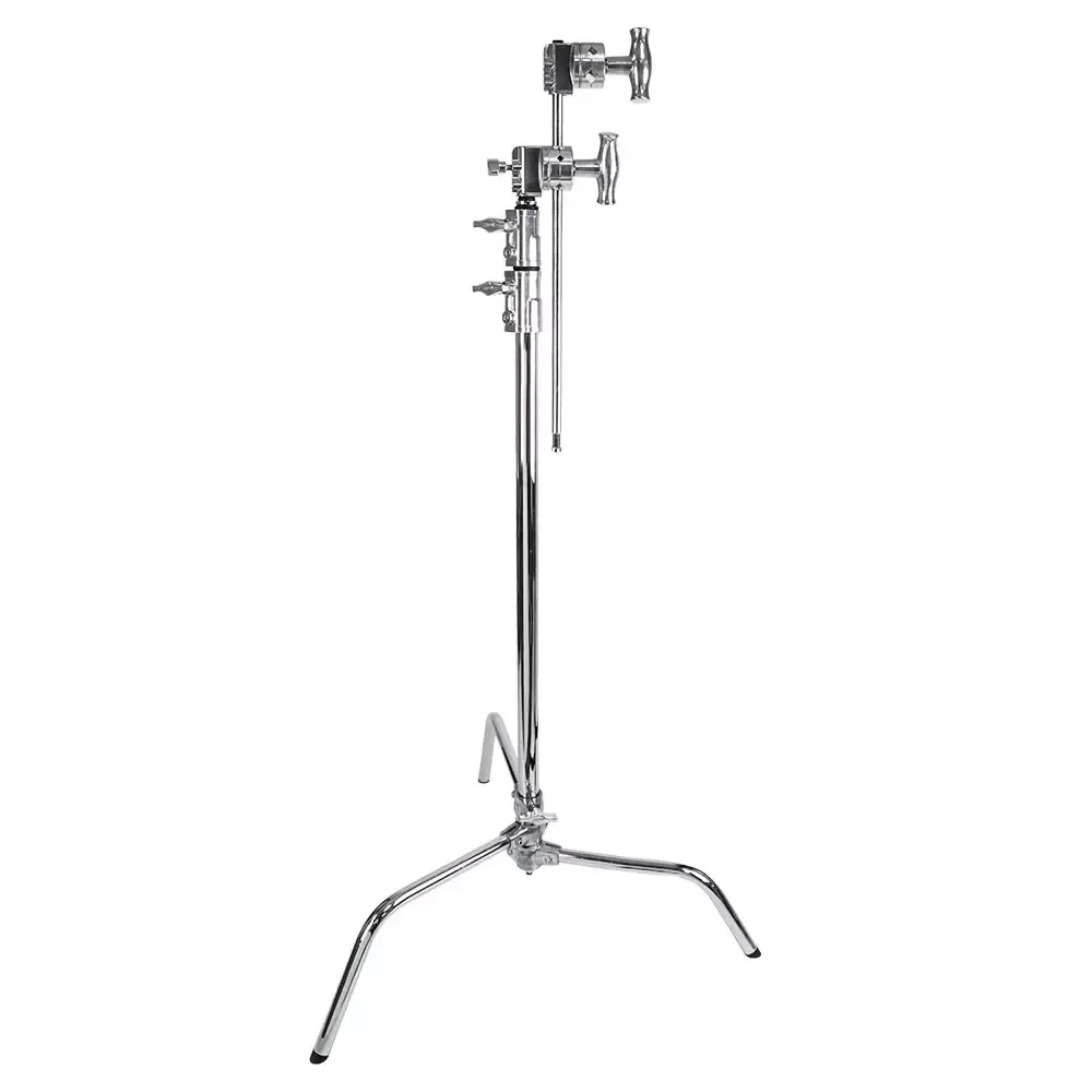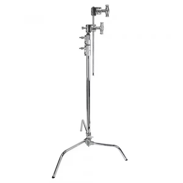 Стойка KUPO CS-20MK MASTER C-STAND имеет две подпружиненные раздвижные ножки, которые устанавливаются в фиксированных положениях, а третья ножка регулируется по высоте путем ослабления ручки-фиксатора и перемещается вверх/вниз по колонне. Это позволяет поднять одну ножку стойки выше остальных, чтобы выровнять стойку на наклонной или неровной поверхности.