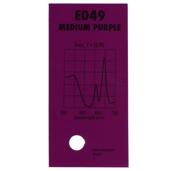 Гелевый (фолиевый) светофильтр Chris James № 049 Medium Purple относится к эффетным фильтрам. Используется со световыми источниками. Данный фильтр применяется для заливки циклорамы.