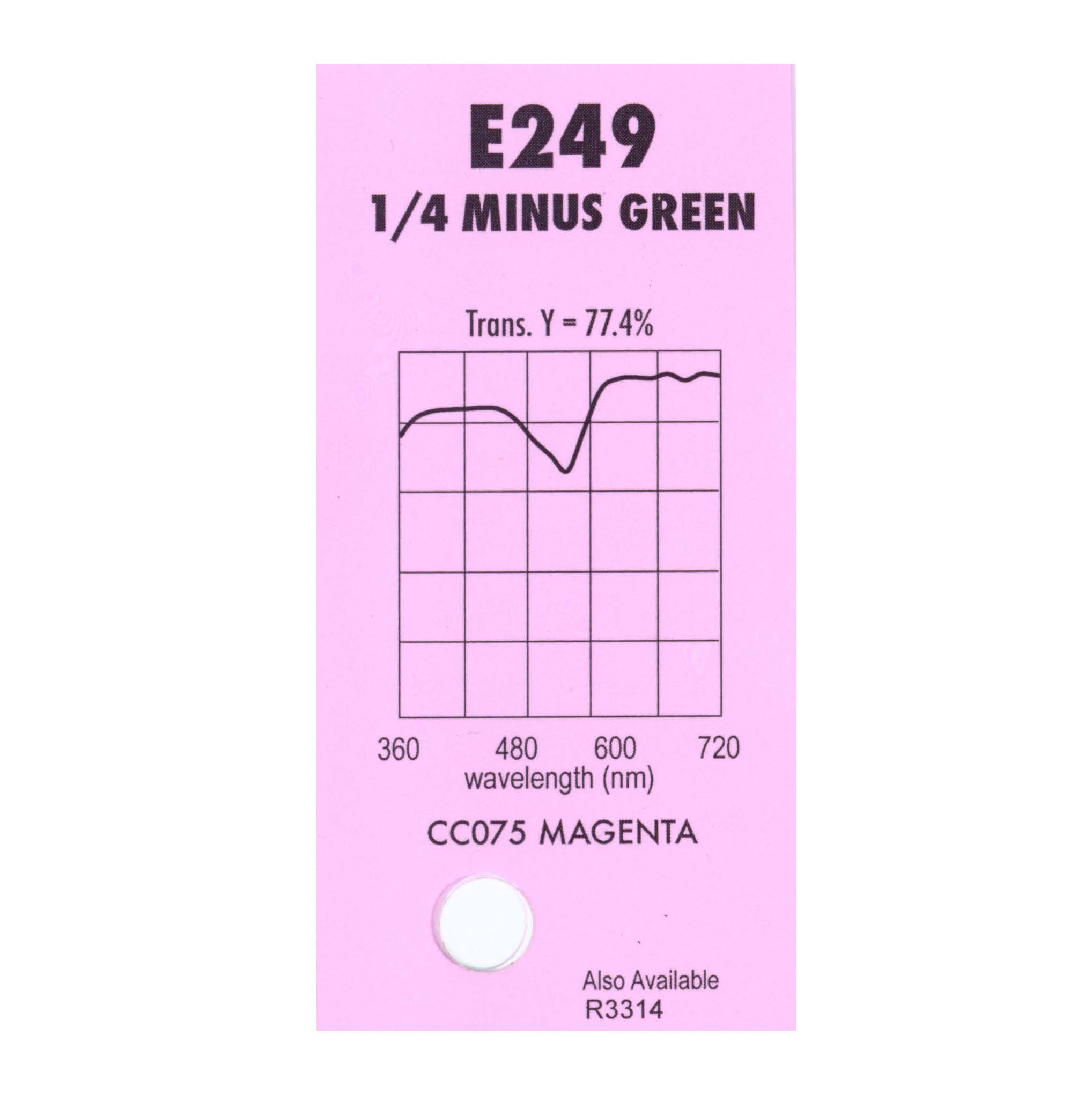 Гелевый (фолиевый) светофильтр Chris James № 249 Quarter Minus green относится к корректирующим фильтрам. Используется со световыми источниками. Данный фильтр применяют для устранения нежелательных зеленых оттенков.