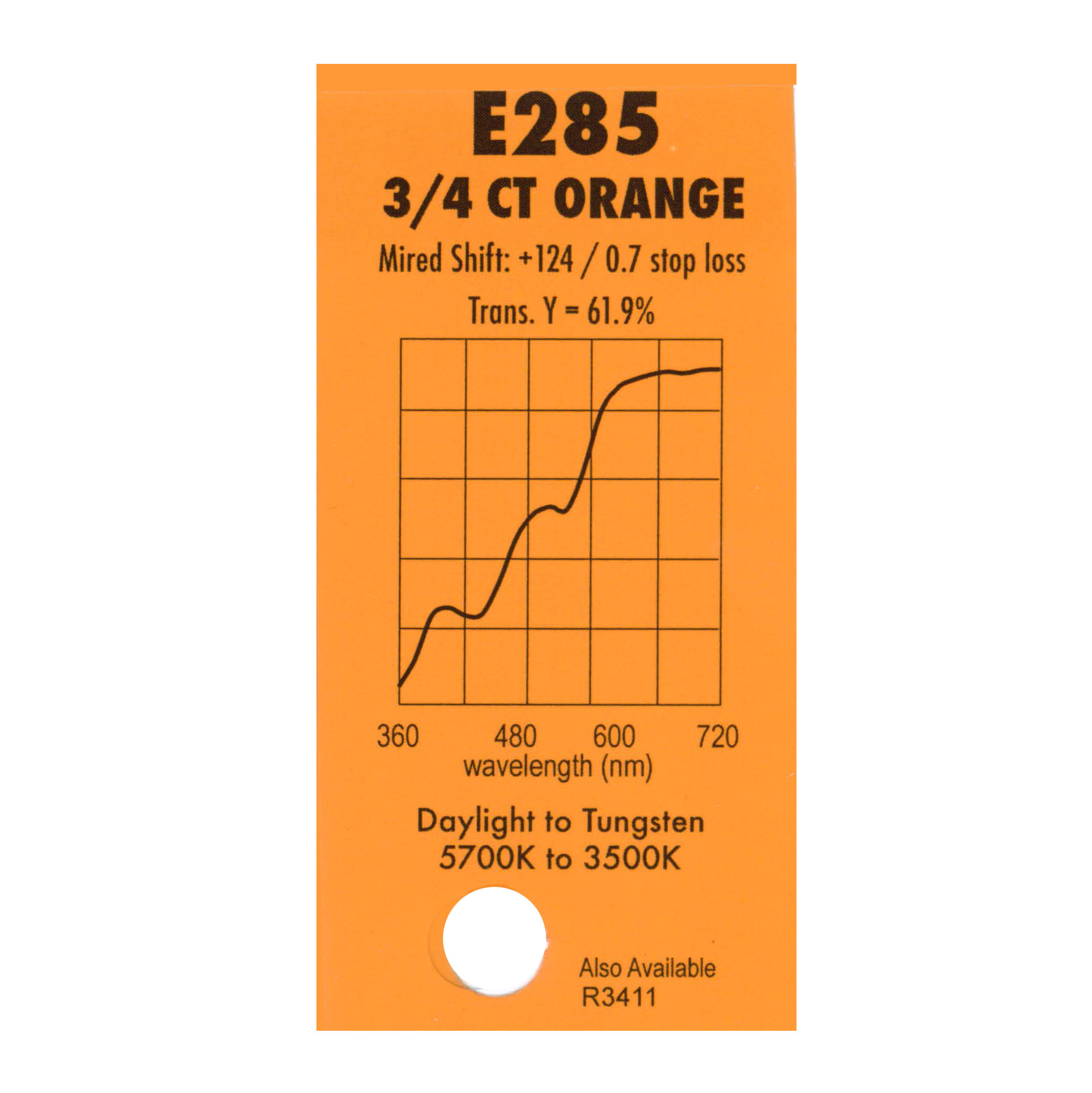 Гелевый (фолиевый) светофильтр Chris James № 285 Three Quarter C.T. orange относится к корректирующим фильтрам. Используется со световыми источниками. Данный фильтр применяют для преобразования света из 5700К в 3500К.