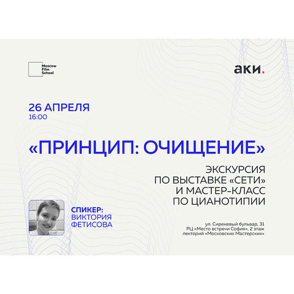 В начале мероприятия Виктория расскажет о своём творческом пути, обучении в Московской школе кино, затем проведёт экскурсию по работам и завершится мероприятие мастер-классом по цианотипии.