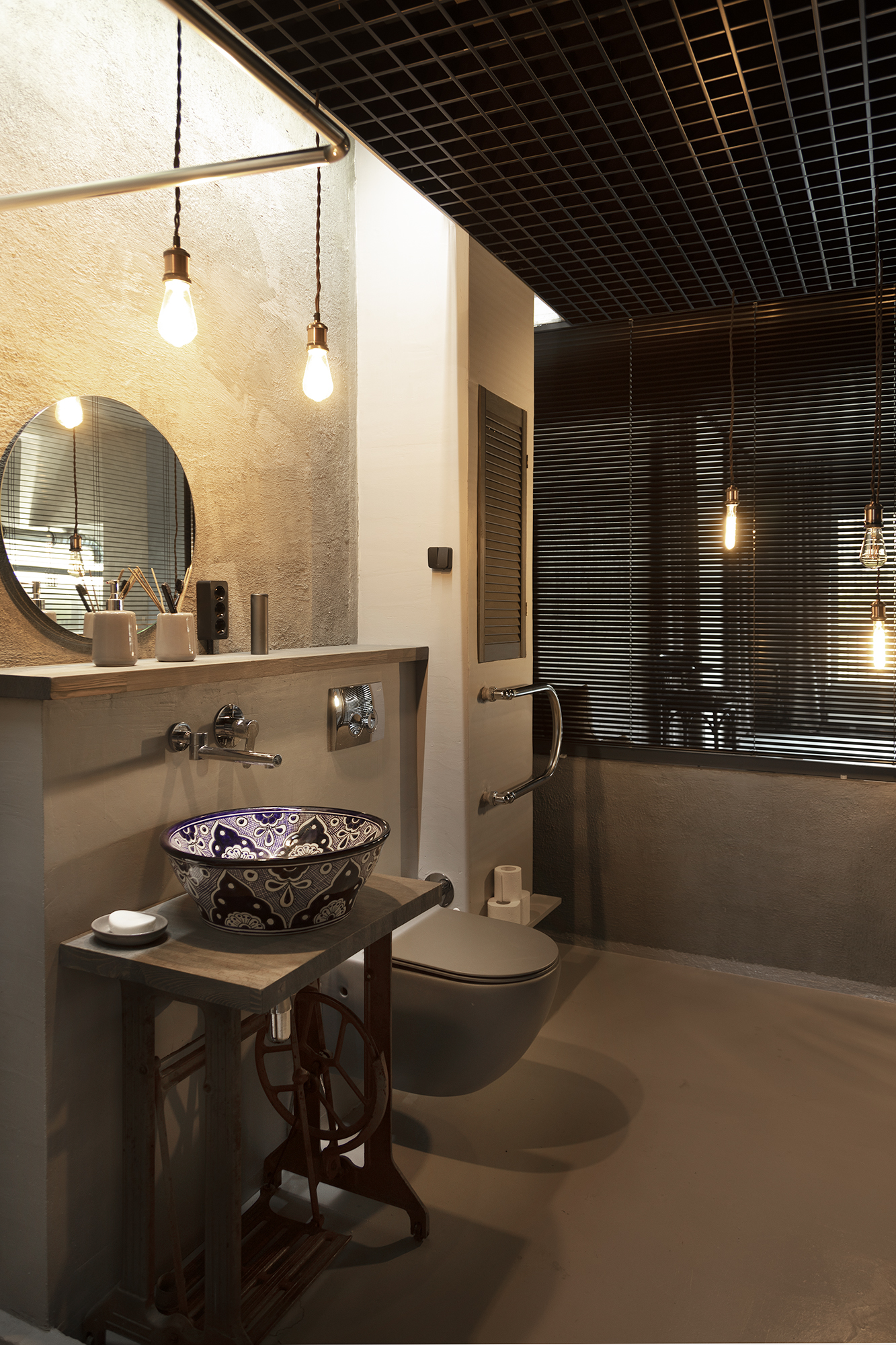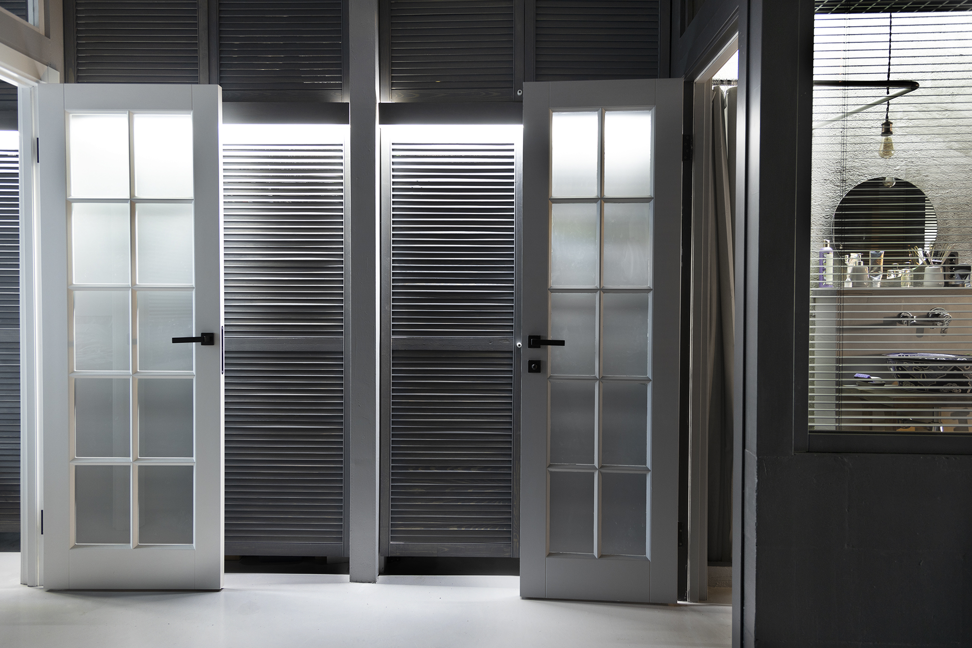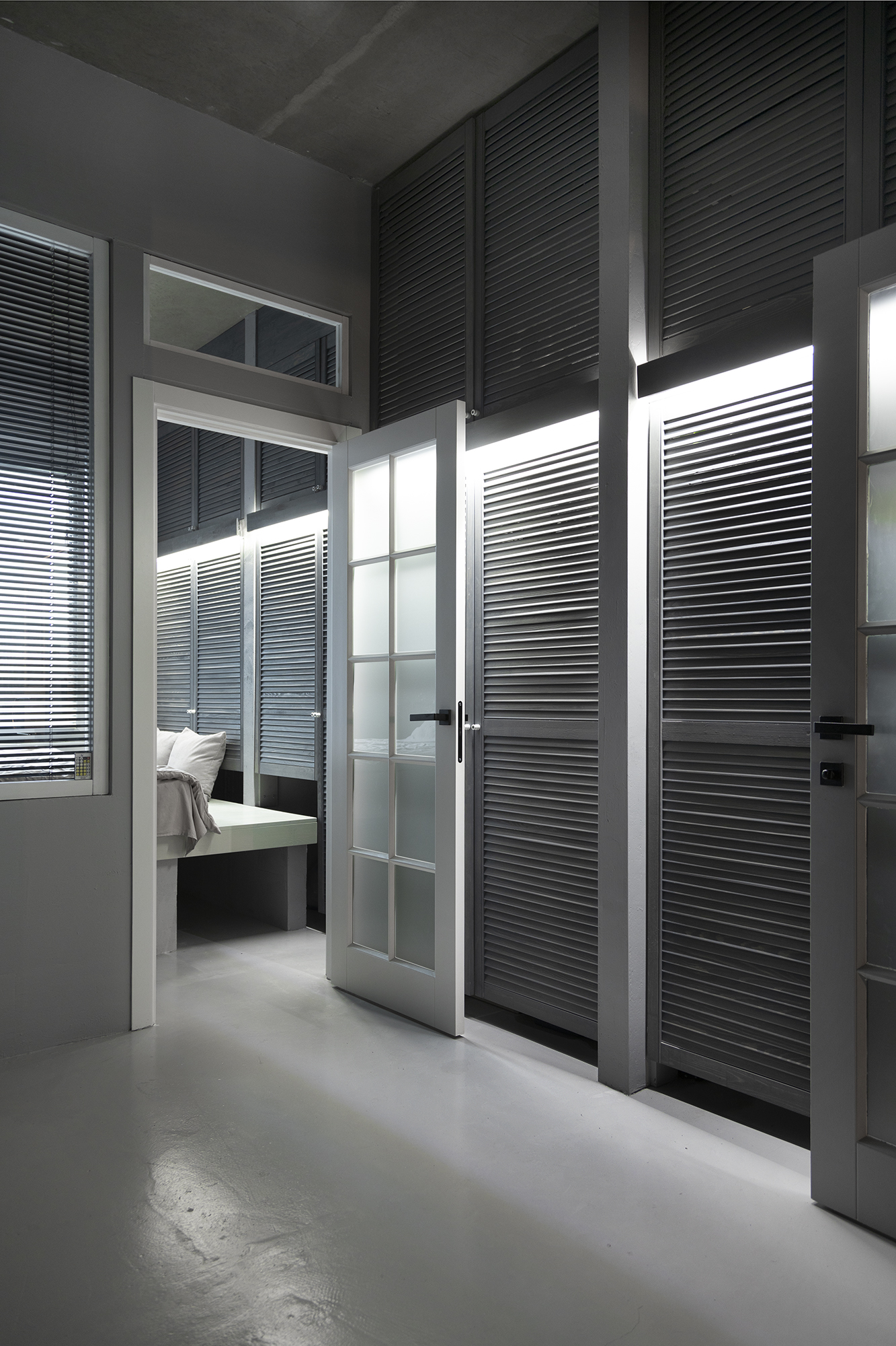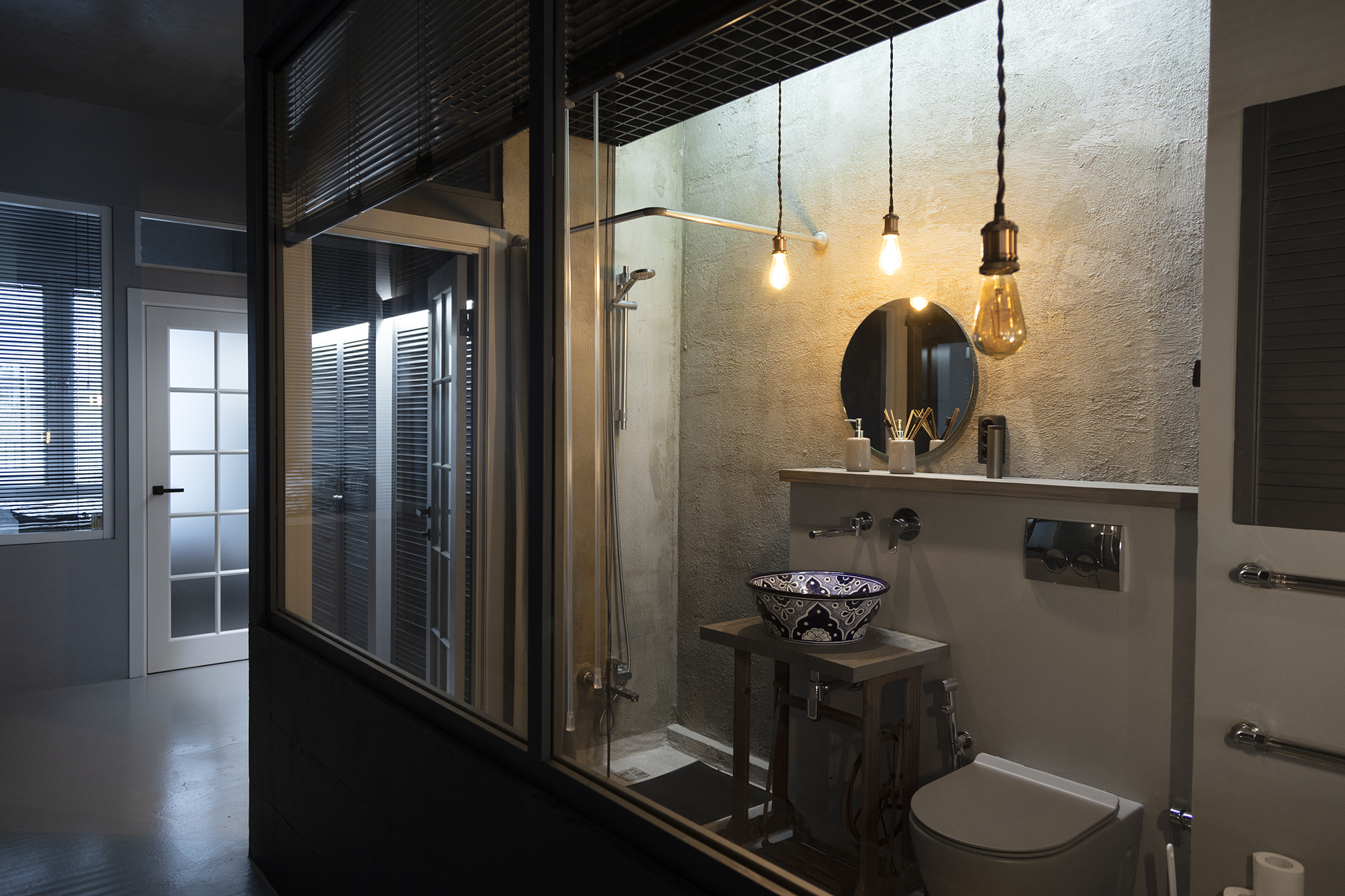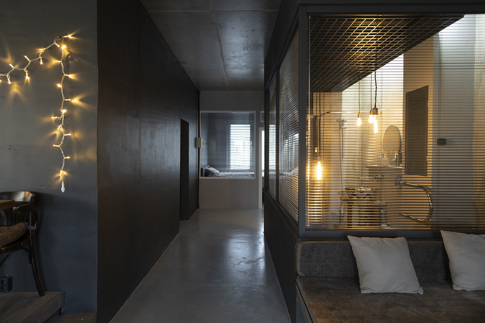 Все внутренние стены – стеклянные, закрываются жалюзи, периметр – бетон и гипсоблоки ( при необходимости можно сверлить )